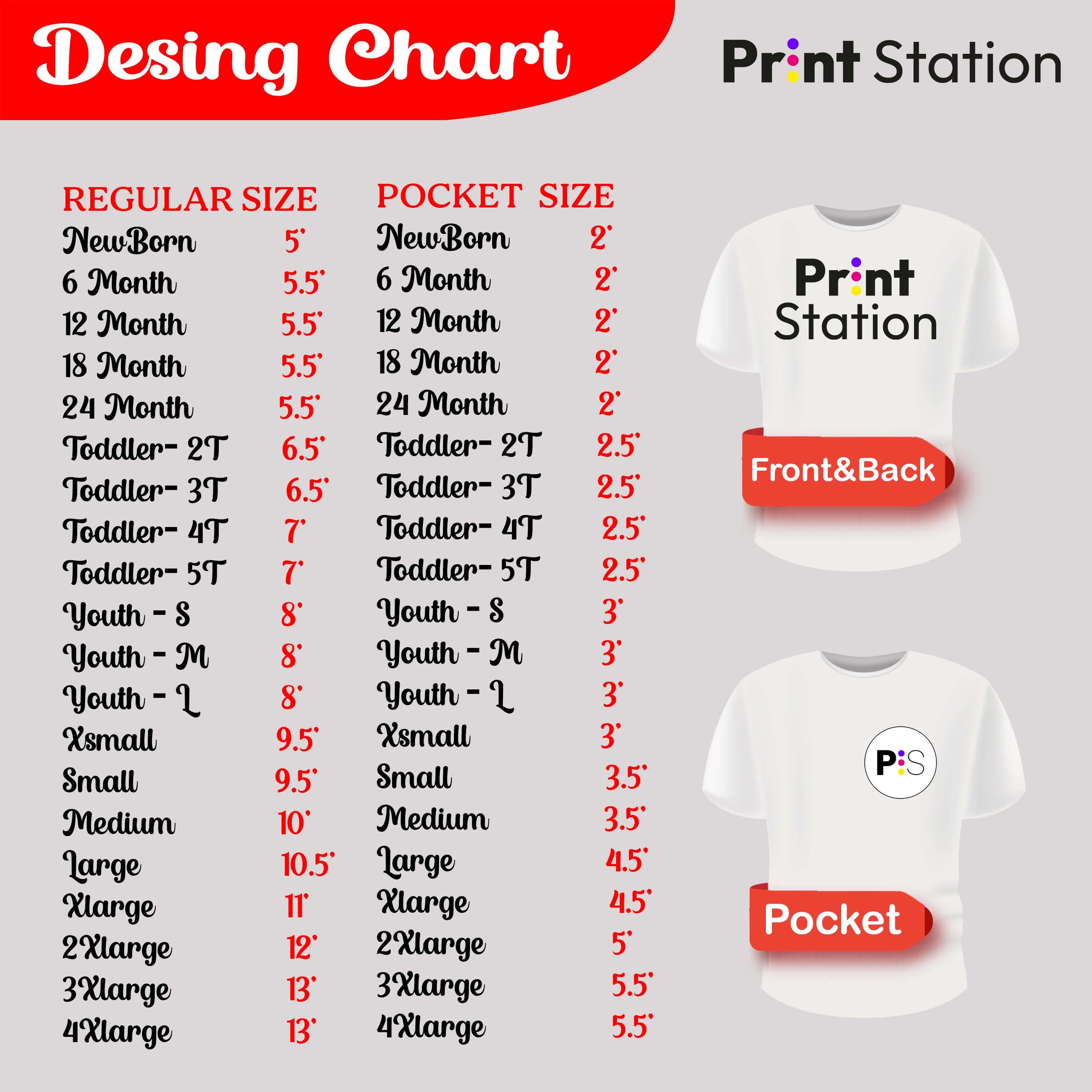 Select from our range of transfer sizes (2"x2" to 14"x18") that perfectly match your t-shirt design needs. Popular sizes include 8"x10" for adult chest prints and 5"x5" for pocket designs.